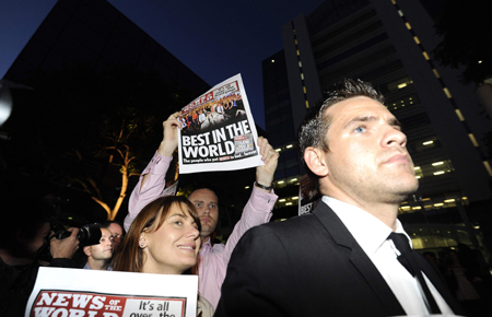 《世界新聞報》可能非法取得犯罪受害人——包括一名被綁架而后被撕票的13歲女童——語音郵件信息的事情被揭露,在英國引起公憤,也讓這家報紙陷入危機,外界原以為該報只關注名人和其他聲名顯赫人物的動向。(路透社)