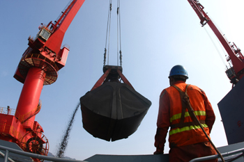 江蘇連云港煤碼頭正在卸載進口的煤炭。新華社發 |