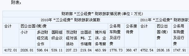 財政部2010年財政撥款開支的“三公經費”支出決算和2011年預算情況