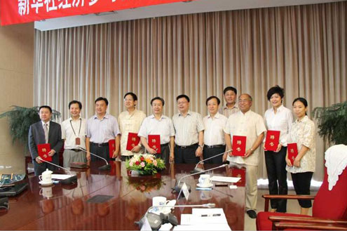 | 新華社副總編輯吳錦才(左六)出席會議并向研究院的院長、副院長發放聘書。 |