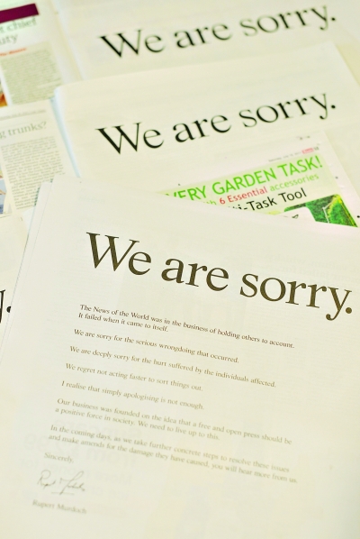 據路透社17日消息,默多克新聞集團下屬新聞國際前首席執行官麗貝卡·布魯克斯因竊聽丑聞被英國警方逮捕,清查仍在繼續。而默多克最新公開的道歉信也未能平民怨,英國的執政黨和在野黨都不滿意他的道歉,希望把新聞集團徹底趕出英國。 上圖為布魯克斯(右)和默多克。下圖為16日英國各大報紙當天刊登該道歉信。