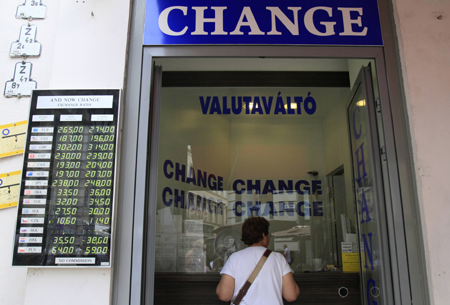 18日,一名顧客在布達佩斯外匯兌換處。當日匈牙利福林兌瑞士法郎匯率跌至歷史新低,兌歐元跌至四個月來低點,同日波蘭貨幣也大幅貶值。歐債危機持續令投資者更加青睞避險資產,從而沉重打壓了歐元區邊緣國家資產價格和貨幣幣值。