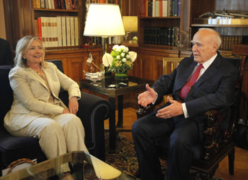 7月17日,希臘總統帕普利亞斯(右)在雅典會見到訪的美國國務卿希拉里·克林頓。 美國國務卿希拉里·克林頓當天在這里表示,美國支持希臘政府和人民解決債務危機的努力,并對希臘解決債務危機的前景感到樂觀。新華社發 |