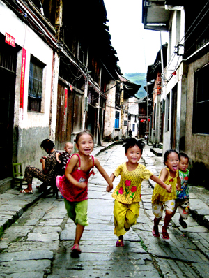 羊樓洞因茶而興,然而走在今日的石板街上,卻少見以茶為生的人家。街面全以青石鋪設,蜿蜒穿過一排排青磚黑瓦的小木樓,孤獨的老人們坐在低矮的房檐下守候著流水的光陰。歷代運茶的“雞公車”將石板碾成寸余深槽,據說是那個年代鄰近的鄉鎮運送茶葉和貨物時碾壓而成的,可見當時茶市的興盛。