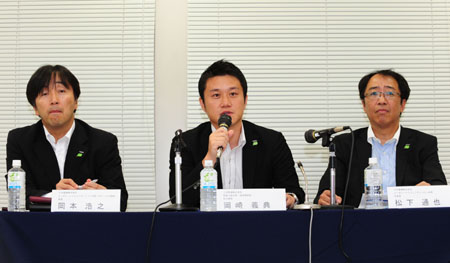 7月28日,在日本首都東京舉行的記者說明會上,三洋經營戰略部課長岡崎義典(中)在介紹情況。 當日,日本松下集團子公司三洋電機在記者會上宣布,將向中國家電巨頭海爾集團出售洗衣機和冰箱業務。這將是中國企業首次收購日本大企業主營業務。此次收購有望在今年年內完成。