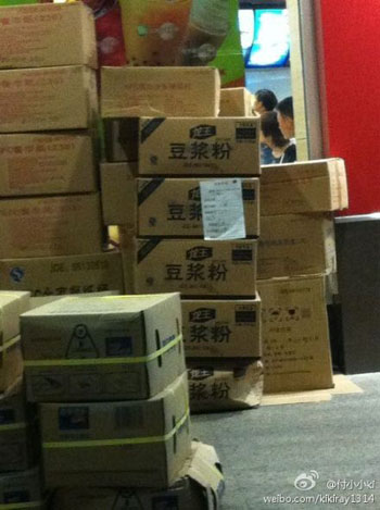 圖為網友曝出的肯德基門店外堆放著幾箱豆漿粉原料。(來源:網友微博上傳)