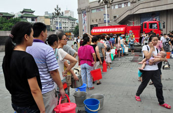 7月27日,綿陽市民在綿陽消防支隊送水點排隊打水。新華社發(王二來/攝) |