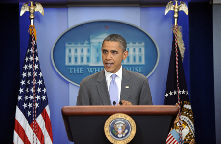 7月31日,在美國華盛頓白宮,奧巴馬在記者會上宣布美國國會兩黨已就提高債務上限達成一致。 分析認為,如果這份協議未來幾天在國會兩院順利獲得通過,備受全球關注的美國債務違約警報將暫時得以解除,但美國長期債務形勢依然嚴峻。