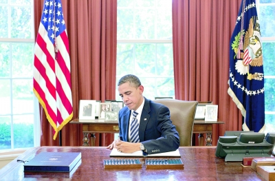 美國總統奧巴馬8月2日簽署了提高美國債務上限和削減赤字法案。至此,持續數月的美國債務上限和政府違約風險的討論將暫告一段落。 美國會參議院當天以74比26的投票通過了提高美國債務上限和削減赤字法案。此前一天,眾議院以269比161的投票通過了這一法案。 圖為奧巴馬當天在白宮橢圓形辦公室簽署提高美國債務上限和削減赤字法案。