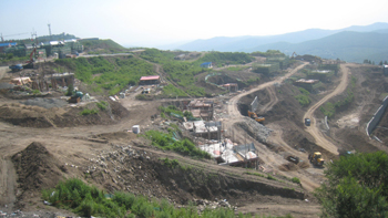 8月3日,《經濟參考報》記者登上綏芬河市區東南一公里的前山要塞風景區,這里已經成為粵水電房地產項目“新都綏園”一期建設工地。風景區內偌大的建設工地上,挖掘機、推土機和運輸車輛穿梭往來、塵土飛揚,山體被挖得溝壑縱橫。十幾幢獨棟別墅已完成主體框架結構,部分已經封頂,多處正在進行基坑開挖。