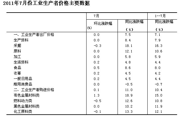 2011年7月份,全國工業生產者出廠價格與上月持平,比去年同月上漲7.5%。工業生產者購進價格比上月上漲0.1%,比去年同月上漲11.0%。