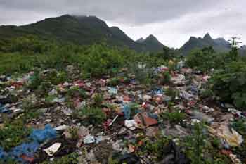 在廣西陽朔縣興坪鎮西塘黃花坪垃圾填埋處理場,簡單處理的垃圾在青山綠草間格外扎眼。資料照片 |