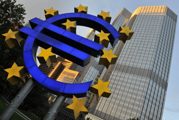 歐洲央行認為歐元區經濟增長艱難。這是8月11日在德國法蘭克福拍攝的夕陽照射下的歐洲中央銀行大樓和歐元標志。記者 馬寧 攝 |