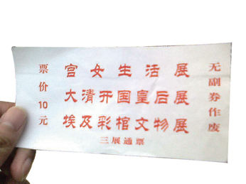 今天上午,記者趕到故宮南側的端門內,從端門往北至午門的路段兩側,楊貴妃展、中國歷代皇后展、女皇武則天展等展廳達十余家。 展覽門票價格不等,主要分為5元和10元兩種,部分展廳聯合售票,如埃及文物彩棺展、大清開國皇后展、宮女生活展等三家展廳通票為10元。 但所謂門票,其實只是一張白底的紙,類似于手撕發票,上面印著展覽主題和票價。票面沒有任何公章,也沒有主管單位的落款。 針對記者提出的報銷問題,工作人員表示,“這是內部票”,并掏出一張天安門城樓的票,稱可以拿回去報銷。