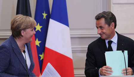 8月16日,法國總統薩科齊(右)與來訪的德國總理默克爾在總統府愛麗舍宮出席聯合記者招待會。 法國總統薩科齊和德國總理默克爾16日在巴黎表示,法德兩國將共同提出成立歐元區經濟政府、成員國實施財政平衡政策、征收金融交易稅等建議,以加強歐元區經濟治理,應對目前歐元區面臨的債務和經濟增長危機。