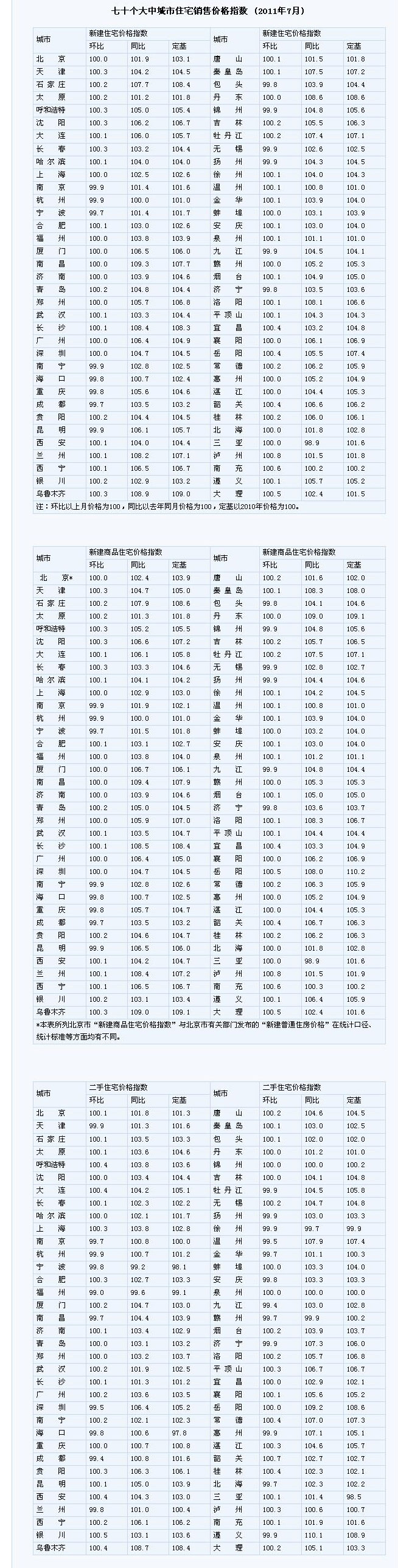 (一)與上月相比,70個大中城市中,價格下降的城市有14個,持平的城市有17個。與6月份相比,7月份環比價格下降和持平的城市增加了5個。價格上漲的城市中,環比漲幅均未超過1.0%,漲幅比6月份縮小的城市有15個。