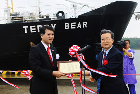 18日,在日本新澙港,中國駐日大使程永華向新澙縣知事泉田裕彥(左)轉交由從扎魯比諾港出發的巴拿馬籍貨船“泰迪熊”號運來的吉林省捐助日本災區的物資。 當日,橫跨中日俄三國的日本海陸海聯運航線通航儀式在日本新澙港舉行。這是首條從中國東北地區橫貫日本海直達日本西海岸的航線,標志著連接中日俄等東北亞地區的環日本海經濟圈和圖們江地區國際合作邁出了實質性的重要一步。
