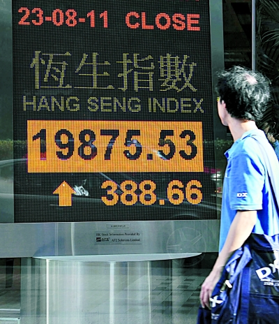 圖為23日一市民從香港灣仔一家銀行的恒生指數電子顯示屏前走過。