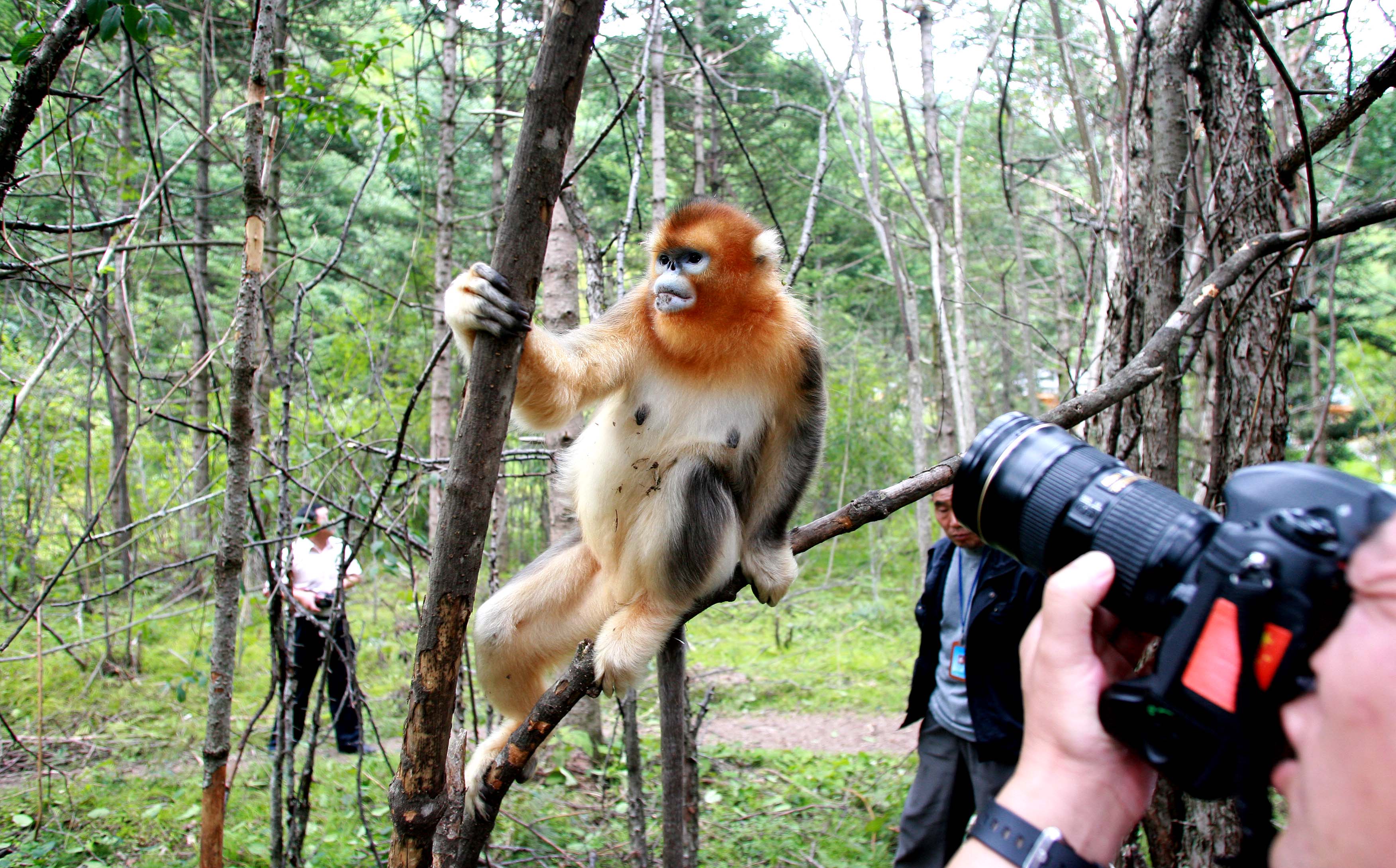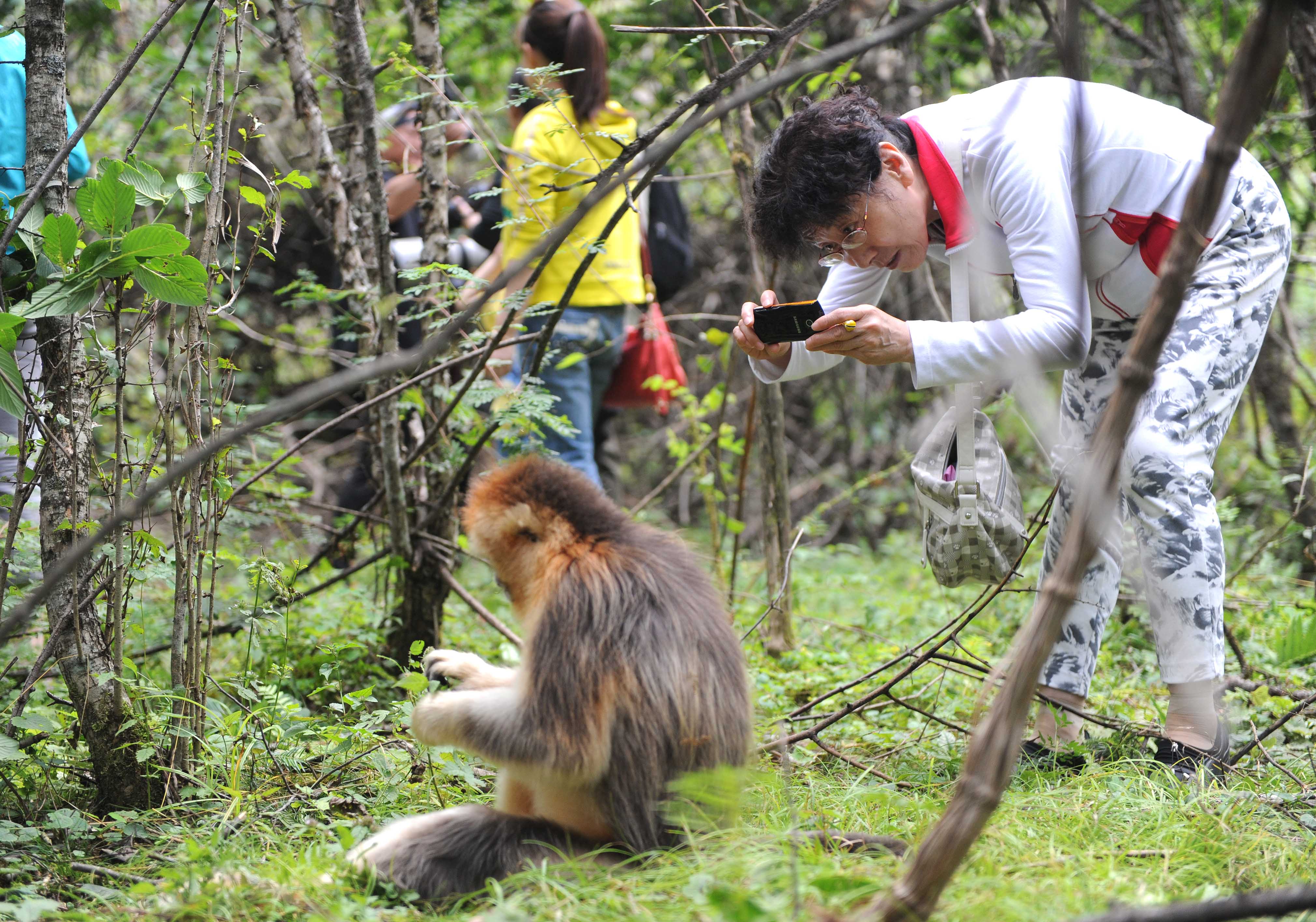 2011年8月21日,游客在湖北宜昌神農架拍攝金絲猴。據介紹,神農架的金絲猴屬“川金絲猴”品種,有金黃和灰色兩種,由于其數量已十分稀少,被列為國家一級保護動物。金絲猴在神農架分布在海拔2000-3100米的高山針葉林和針闊葉混交林中,經過動物保護人員的多年努力,加之神農架生態環境的不斷改善,神農架金絲猴得到有效保護,數量已經從最少時候的600多只,增加到現在1300多只。2011年,僅神農架大龍潭金絲猴研究基地就新增8只幼猴。