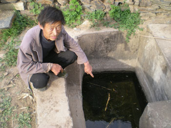 村民劉佃滿蹲在村頭一個一米見方的小水窖邊告訴記者,他今年61歲了,從小水窖里挑水吃差不多挑了50年。記者 李鈞德/ 攝 |