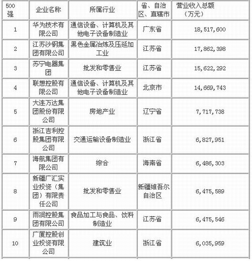 2010年中國民營企業500強名錄日前在北京公布。華為技術有限公司、江蘇沙鋼集團有限公司、蘇寧電器集團位列前三名。雖然中國民營經過近些年的努力,取得了令人矚目的成績,但是跟國有企業相比還是有很大的差距。中國經濟網記者根據上月由《財富》雜志發布的《2011年中國500強》對比發現,入圍前十強的中國民營企業去年的營業額總和加一起不抵位居中國500強企業榜首的中國石油化工股份有限公司(以下簡稱中石化)一家的營業收入。