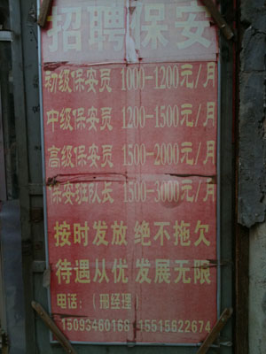 在鄭州火車站布廠街附近,沿著一條窄窄的胡同走進去,一棟兩層小樓毫不起眼地立在三岔路口,第二層的部分外墻甚至都沒粉刷,紅色磚頭清晰可見。樓下是一塊“招聘保安”的廣告牌,因為風吹雨淋,底色已經由紅變白。上面依次寫著初級、中級、高級保安員以及保安隊長的月薪,并且承諾“按時發放,絕不拖欠,待遇從優,發展無限!