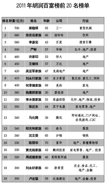 9月7日,胡潤研究院發布《2011雅居樂海南清水灣胡潤百富榜》的前50名,這是胡潤研究院自1999年以來第十三年發布“胡潤百富榜”,從這些富豪的排名的起起落落中,自2008年金融危機以來中國各行業的興衰起伏可窺見一斑。