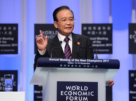 9月14日,世界經濟論壇2011年新領軍者年會(第五屆夏季達沃斯論壇)在大連開幕。國務院總理溫家寶出席開幕式并致辭。 溫家寶說,將繼續實施積極的財政政策和穩健的貨幣政策,切實把握好宏觀調控的力度、節奏和重點,處理好保持經濟平穩較快發展、調整經濟結構、管理通脹預期三者的關系。新華社記者 馬占成 攝