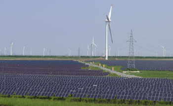 在江蘇大豐市王港南側的黃海灘涂上,成片的光伏發電組件和聳立的風電機組交相輝映。新華社發(周古凱/攝) |