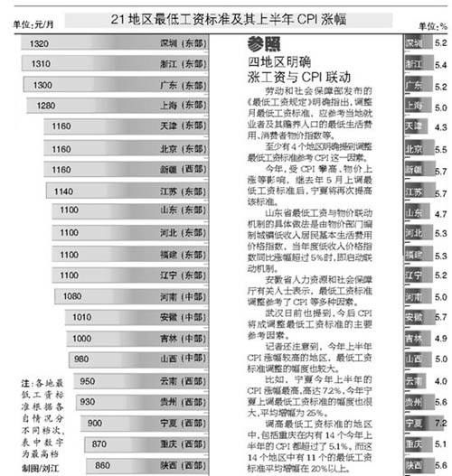 全國21地區已調高最低工資深圳最高重慶增幅居首21個地區最低工資標準及其上半年CPI漲幅