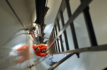 從“拼價格”到“拼質量”,“風馳電掣”走向世界。圖為某風電企業工作人員在新疆達坂城風力發電場風電機組塔架里工作。記者