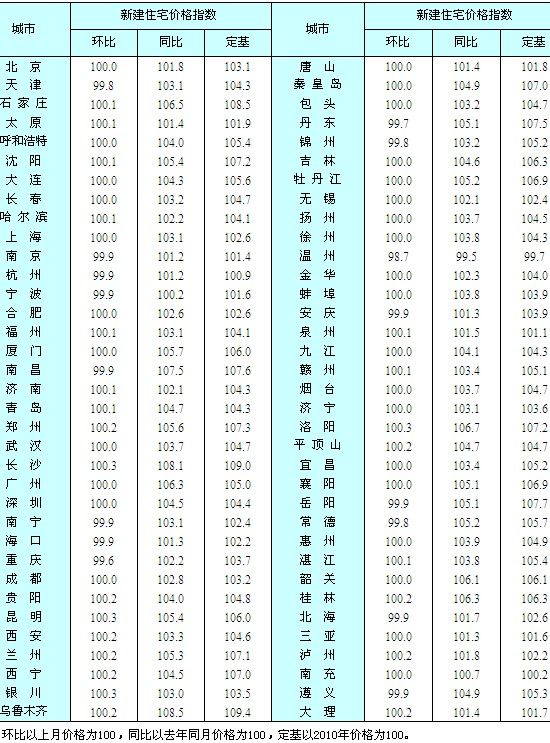3、2011年9月份,68個城市的新建住宅價格指數根據網簽數據計算,其他2個城市根據統計系統房地產開發統計報表中各個項目的分類銷售面積和金額數據計算。68個網簽數據城市分別是:北京、天津、石家莊、太原、呼和浩特、沈陽、大連、長春、哈爾濱、上海、南京、杭州、寧波、合肥、福州、廈門、南昌、濟南、青島、鄭州、武漢、長沙、廣州、深圳、南寧、?、重慶、成都、貴陽、昆明、西安、蘭州、西寧、銀川、烏魯木齊、唐山、秦皇島、包頭、丹東、吉林、牡丹江、無錫、揚州、徐州、溫州、金華、蚌埠、安慶、泉州、九江、贛州、煙臺、濟寧、洛陽、平頂山、宜昌、襄陽、岳陽、常德、惠州、湛江、韶關、桂林、北海、三亞、瀘州、南充、大理。9月份新增加的城市是唐山、贛州、大理。