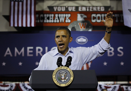 10月17日,美國總統奧巴馬在北卡羅來納州阿什維爾市發表演講。 奧巴馬當日表示,就業問題是美國各地民眾最關心的議題之一,美國會應當盡快通過就業促進法案,通過加大基礎設施投資等方式創造民眾迫切需要的就業崗位。奧巴馬17日開始在北卡羅來納州和弗吉尼亞州進行為期三天的巡回演講。