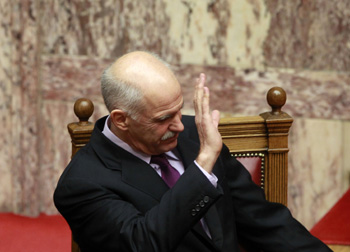 10月19日,希臘總理帕潘德里歐在希臘首都雅典舉行的議會上就新一輪緊縮措施法案表決。 希臘議會19日晚原則通過包括裁減國營企業員工、增加房產稅等內容的新一輪緊縮措施法案。議會將于20日對該法案進行最終表決。當天早些時候,約10萬名民眾在雅典市中心的憲法廣場舉行示威,反對新一輪緊縮措施。
