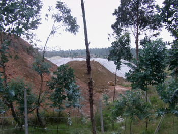 9月27日下午,記者在這個已簡單防護的鉻渣堆不遠處看到很多大小不一的土堆,全都寸草不生,光禿禿一片。常小喬等村民告訴記者,外人會誤以為這些都是天然形成的土堆,其實是廠里這些年不斷堆砌的鉻渣堆,只不過表層覆蓋了幾十公分厚的黃土而已,廠里曾試圖在上面種桉樹但均未能成活。記者發現這些“鉻渣堆”表層的土有的是新堆的,村民反映,出事以后,廠方雇人從別處運土來將一些鉻渣掩埋起來。