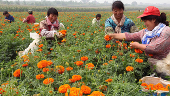平泉花農正在采摘萬壽菊。 |