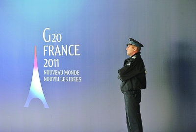 11月2日,在法國南部海濱城市戛納,一名警察站在二十國集團峰會的標志旁。