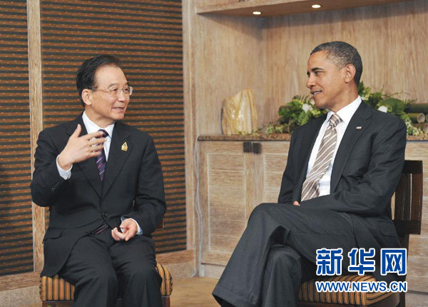 國務院總理溫家寶19日在印尼巴厘島出席東亞領導人系列會議期間會見美國總統奧巴馬。
