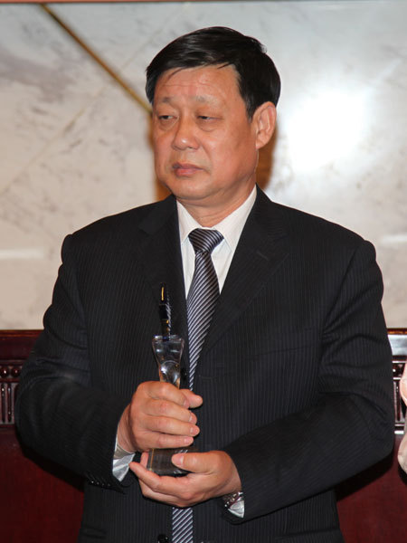“2011綠色發展十大領軍人物、企業、城市”評選活動結束,頒獎典禮于2011年11月19日下午在人民大會堂舉行,上圖為江蘇鎮江市代表領獎。