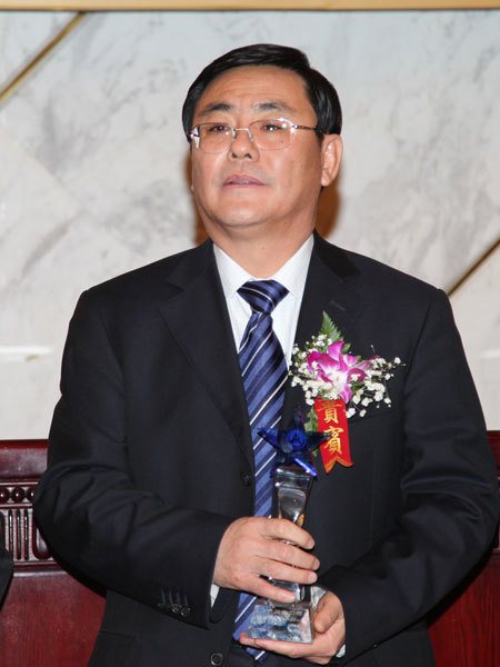“2011綠色發展十大領軍人物、企業、城市”評選活動結束,頒獎典禮于2011年11月19日下午在人民大會堂舉行,上圖為內蒙古鄂爾多斯市代表領獎。