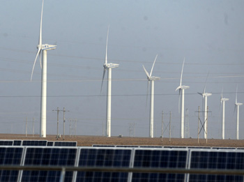 中節能甘肅玉門市昌馬20萬千瓦風電場建設的風電和光伏電場新華社發(資料照片) |