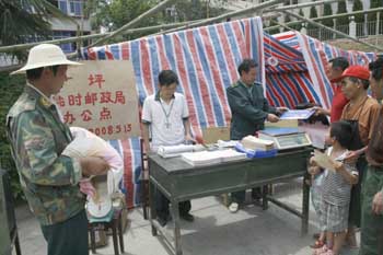 “5·12”地震發生后,漢中市寧強縣廣坪郵政支局第一時間搭建起臨時郵局服務群眾。 |