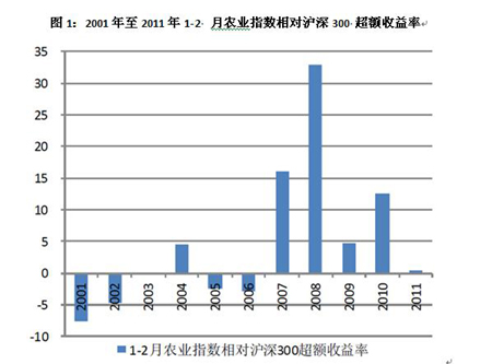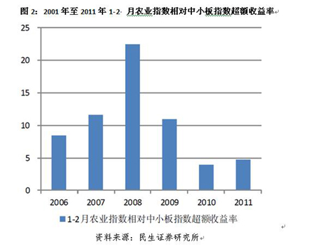 隨著中央對三農問題的重視程度不斷提高,政策頻繁期農業股表現突出。2007年至今,每年1-2月農業股相對大盤和相對中小板指數持續獲得超額收益。