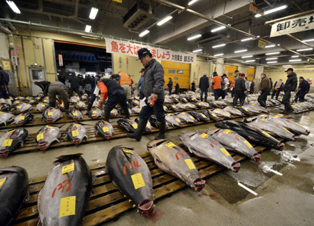 1月5日,在日本東京筑地市場,魚販在新年首個開市日整理待售的金槍魚。在東京筑地市場一年一度的新年“金槍魚王”拍賣活動中,一條重269公斤的藍鰭金槍魚拍出5649萬日元(約合464萬元人民幣)的創紀錄高價,相當于每公斤21萬日元(約合1.7萬元人民幣)。
