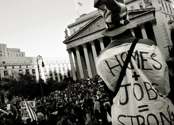 2011年9月17日,“占領華爾街”抗議活動在紐約爆發,聲稱代表99%普通民眾的示威者以紐約祖科蒂公園為大本營,在華爾街附近集會、游行,抗議大公司無節制的貪婪、指責政府對少數金融機構的救助導致美國民眾陷入經濟困境。 這是2011年10月5日,數千名“占領華爾街”活動的示威者在紐約市政廳附近的福利廣場集會抗議。新華社記者