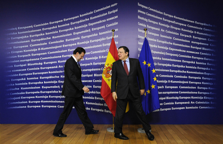 圖為2012年1月30日,在布魯塞爾歐盟總部,西班牙首相拉霍伊和歐盟委員會主席巴羅佐(右)與媒體見面。 據法新社報道,歐洲領導人打算就歐債問題達成一項協議,但在希臘債務問題上,他們將再次產生分歧。 另據法國《費加羅報》30日報道,希臘問題令歐盟峰會頭疼?梢灶A見,本次歐盟峰會不會產生什么重大的突破,能夠在希臘問題上有一些推進就已經很不錯了。