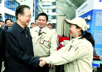 2月3日至4日,國務院總理溫家寶到廣東省走訪企業、村莊。這是2月4日,溫家寶考察白云電氣集團公司時與工人親切交談。