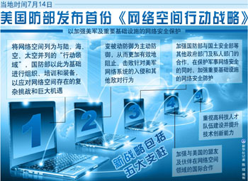 2010年5月美軍建立網絡司令部,據稱至少有3000名信息戰專家和八萬名以上從事網絡戰、電子戰的人員,已研制出的網絡武器(如木馬病毒)超過2000種。2011年5月,白宮發布《網絡空間國際戰略》,宣稱美國將使用一切必要手段防御至關重要的網絡資產,像對待其他任何威脅一樣,對網絡空間的敵對行為作出反應,并保留訴諸武力的權利。7月美國再次發布《網絡空間行動戰略》,為其“防御”制定行動指南。新戰略包括進一步將網絡空間列為與陸、海、空、太空并列的“行動領域”,變被動防御為主動防御,實際上明確了美國的網絡戰進攻思想。