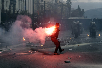希臘議會13日凌晨以2/3多數,通過了該國與歐盟和國際貨幣基金組織達成的關于第二輪救援貸款的協議。根據這一救援協議,希臘政府將實施新的緊縮措施。希臘民眾舉行了反對緊縮措施的示威活動。 圖為在希臘首都雅典市中心議會附近的示威活動中,示威者向防暴警察投擲煙霧彈。