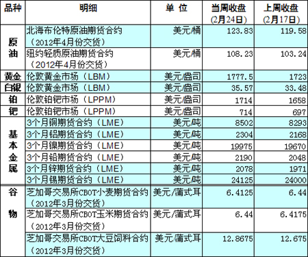 國際大宗商品期貨價格明細表[2012-02-27]